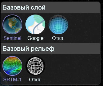 Инструмент выбора базового слоя и рельефа позволяет пользователям переключаться между глобальными базовыми слоями, а также выбирать текущий глобальную модель рельефа из перечня доступных. Настройка и подключение базовых растровых слоев и моделей рельефа выполняются администратором системы с помощью инструмента администрирования.