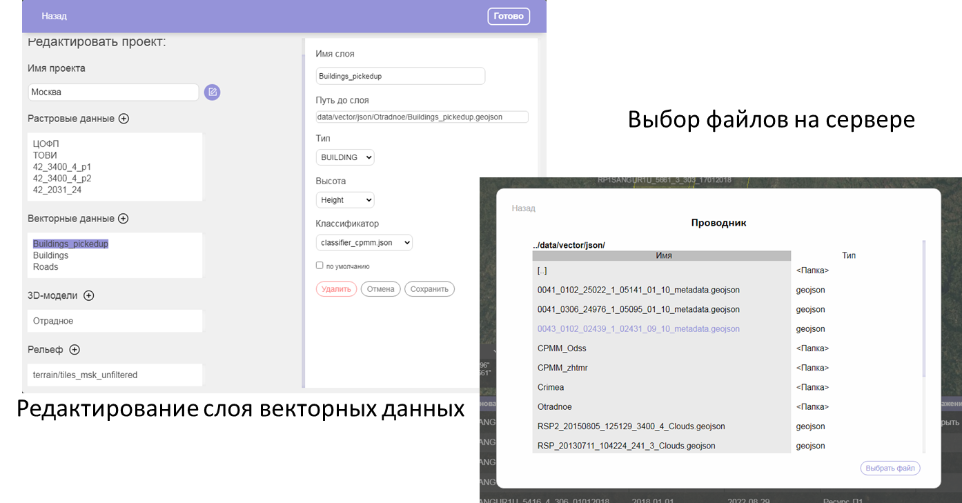 - Добавить векторные данные через указание пути до слоя на сервере и присваивание ему нового имени. Изменить векторные данные можно при помощи клика на соответствующее название. Таким образом, можно изменить имя слоя, путь до слоя, тип, высоту и классификатор. Кроме того, можно удалить необходимые данные при помощи клика по кнопке "Удалить".
