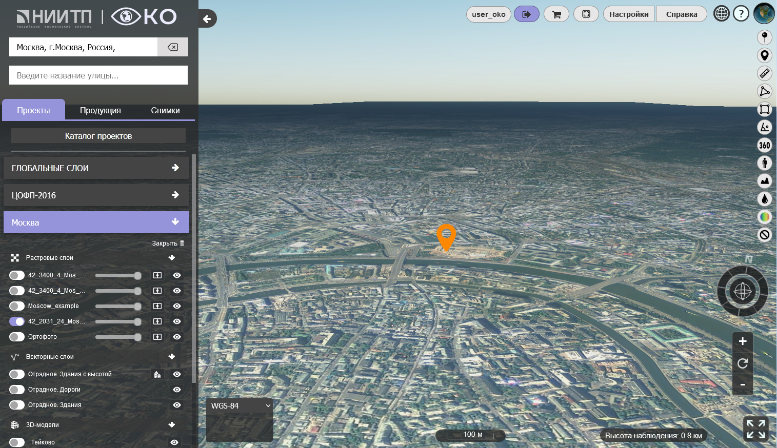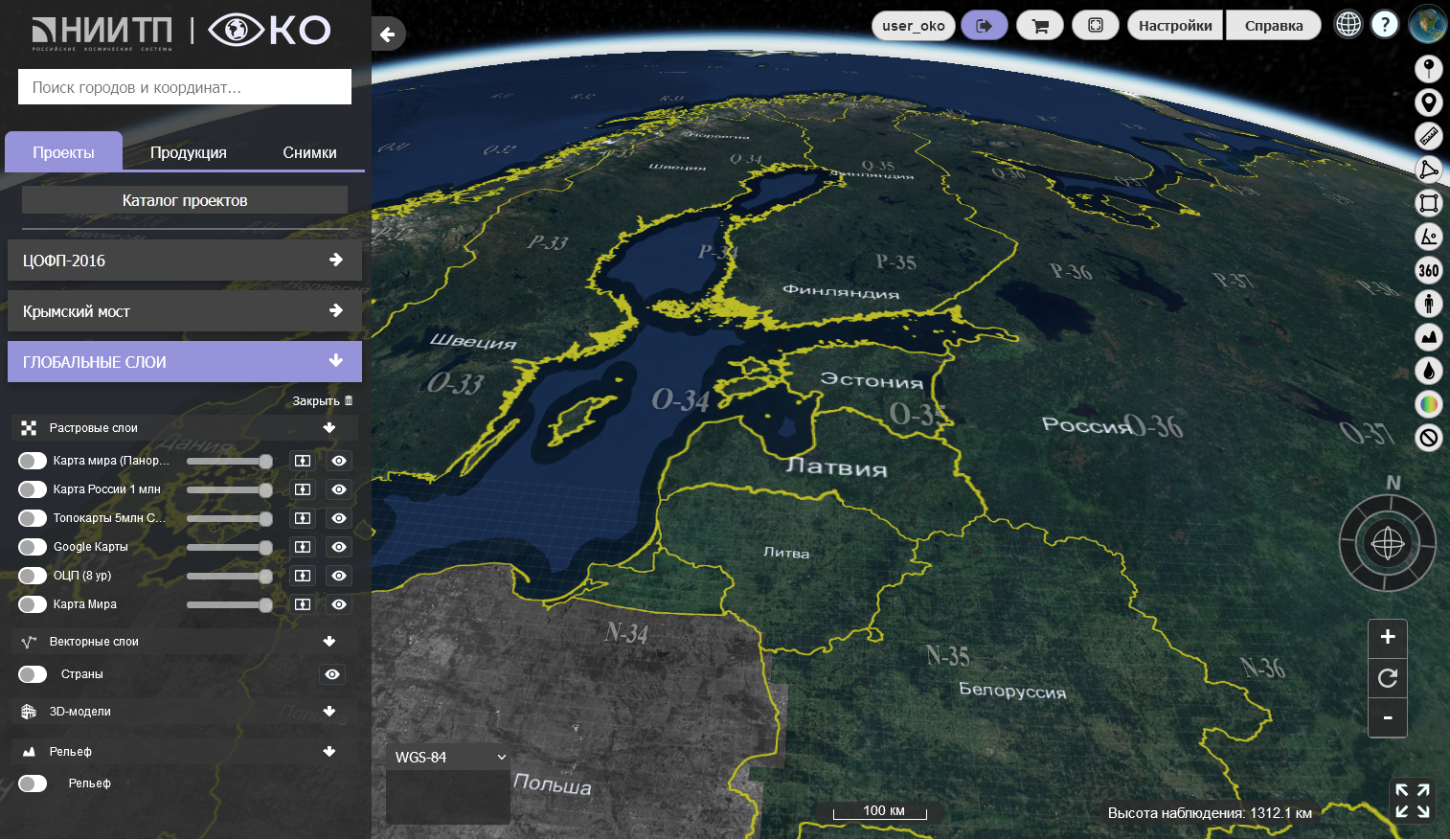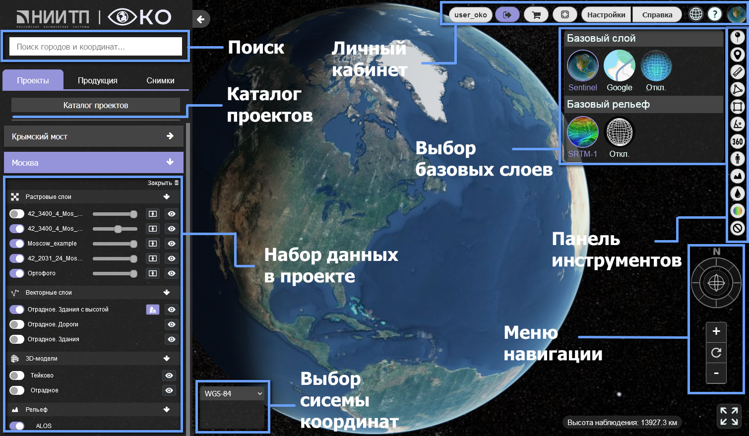 Основными элементами комплекса выступают модули просмотра проектов и продукции, работы со слоями, выбора системы координат, панели инструментов, а также поиска спутниковых снимков и их нанесение на глобус.