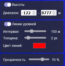 Данный инструмент предназначен для визуализации отмывки рельефа и построения линий уровня. Он позволяет гибко настраивать параметры, такие как дапазон высот для отмывки, интервал, толщину и цвет линий уровней, а также прозрачность слоя.