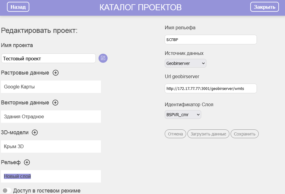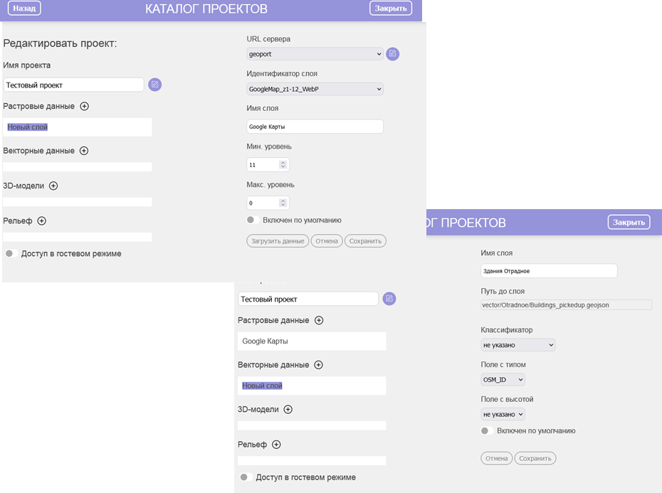 Добавление новых слоев в существующий проект производится через меню "Проекты" и редактирование нужного проекта (см. раздел "Работа с проектами").