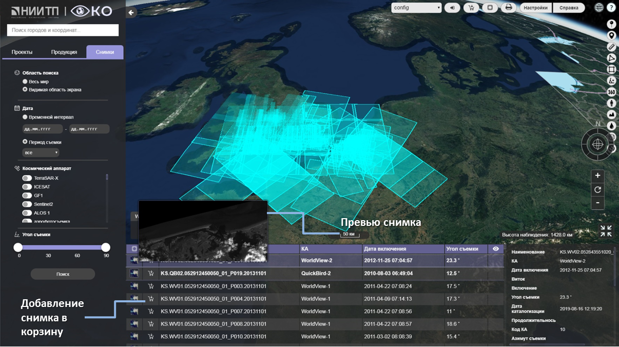 По завершении настройки фильтров, необходимо нажать на кнопку "Поиск", чтобы открыть меню с каталогом подходящих снимков. При наведении курсором на содержимое крайнего левого столбца будет показано увеличенное изображение для предпросмотра. Также доступен просмотр отображения спутникового снимка с привязкой к конкретным координатам.