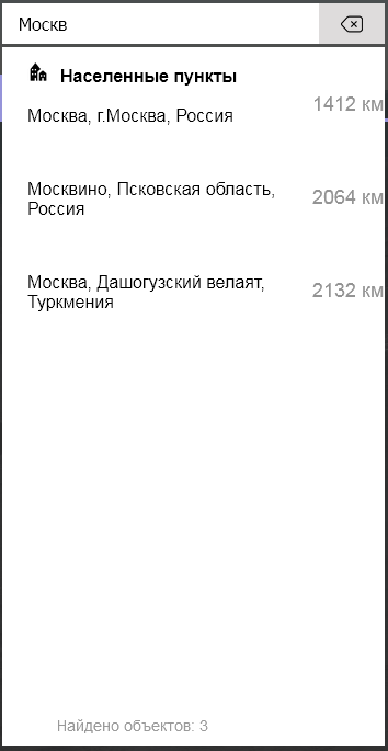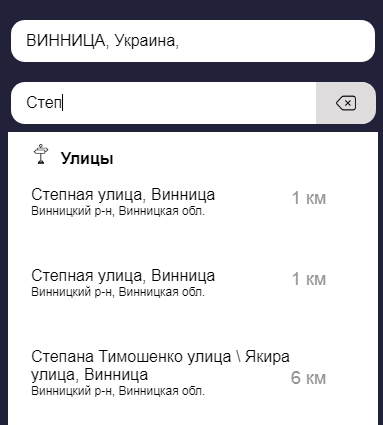 В рамках комплекса также доступен поиск по базе данных адресов, как по названиям улиц и городов, так и при помощи ввода координат. Для начала поиска необходимо ввести в поисковой строке сначала название населенного пункта (например, "Винница"), затем кликнуть по нужной строке, после чего откроется дополнительная поисковая строка для ввода названия улиц.