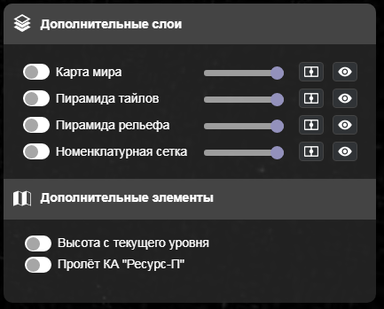 Настройки карты позволяют управлять отображением и настройками видимости настроенных администратором дополнительных слоев, наносимых поверх всех остальных слоев, а так же номенклатурной и тайловой сетки. Кроме того, данное меню позволяет осуществить визуализацию пролета космического аппарата Русурс-П в момент съемки в демо-режиме.
